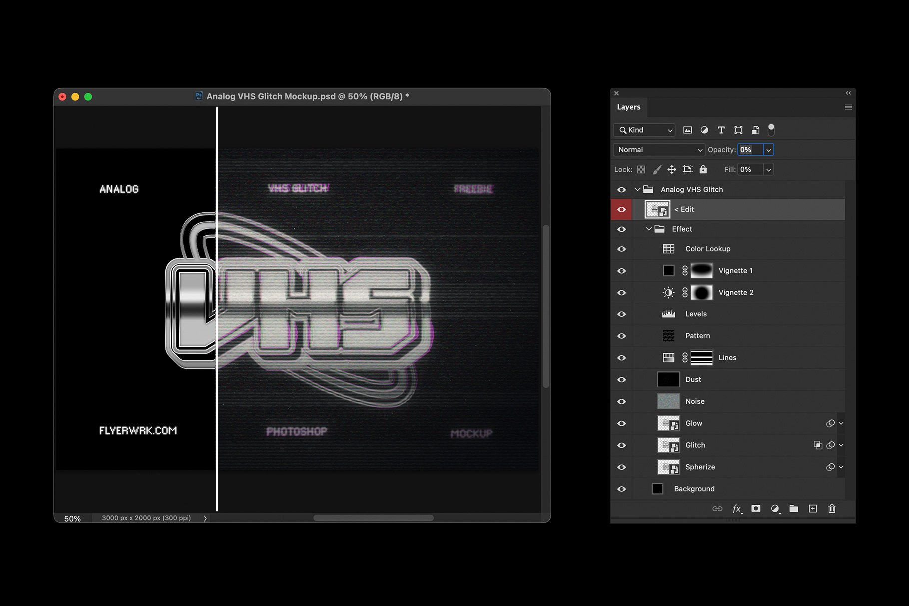 Turn clean artwork into gritty retro tape goodness in seconds. Analog VHS Glitch Mockup is a Photoshop PSD that recreates a classic VHS playback look with noise, distortion, scanlines, and that tasty analog color shift. Just drop your design in via Smart Object, then toggle effects on or off until it feels like the perfect “recorded off TV” moment.
