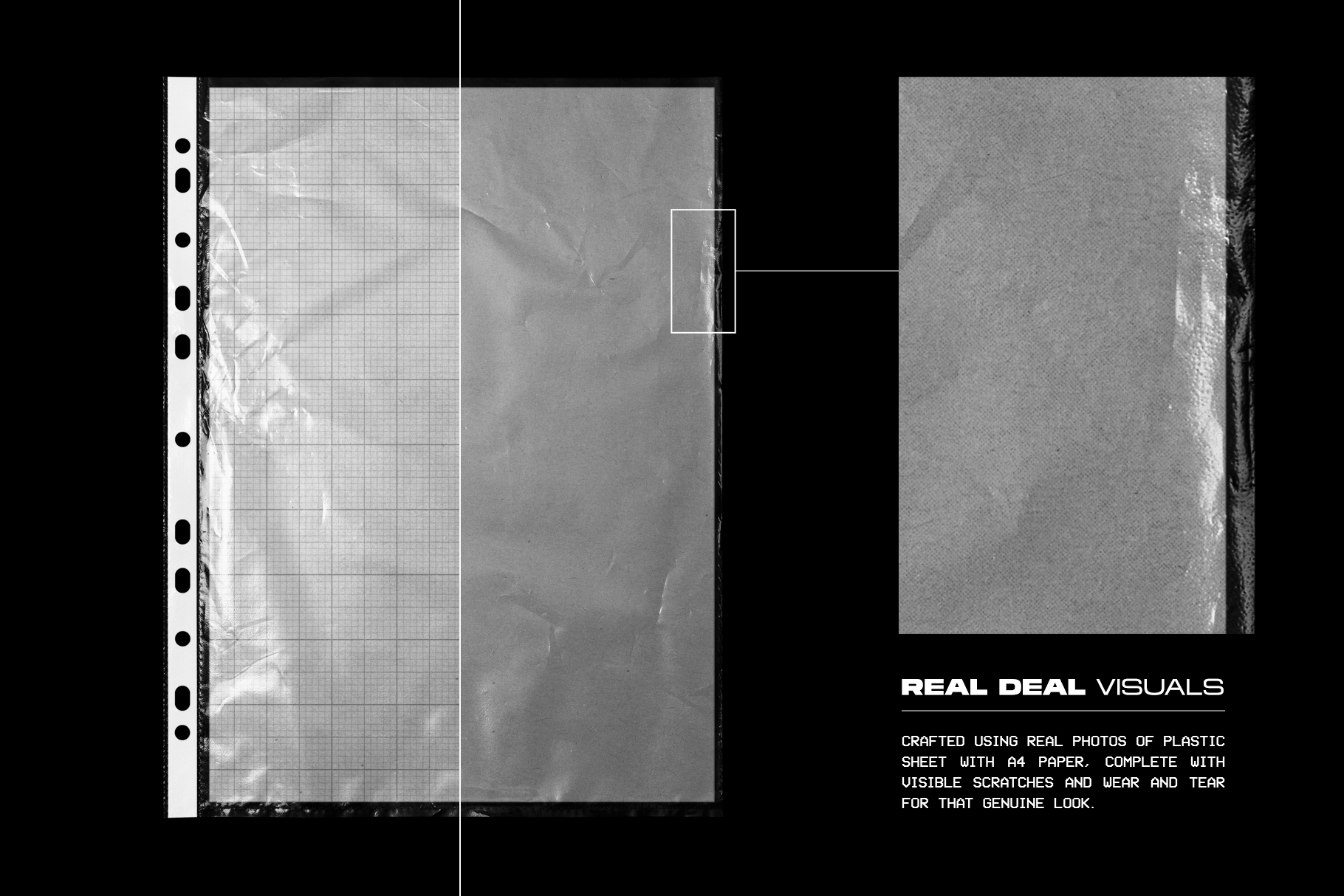 Bring real-life vibes to your next project with this high-res Plastic Sheet Overlay Mockup. Crafted entirely from scratch using a 50mm macro lens, it captures every detail of a transparent, wrinkled plastic sheet protector with a classic white-punched strip and an A4 paper inside.